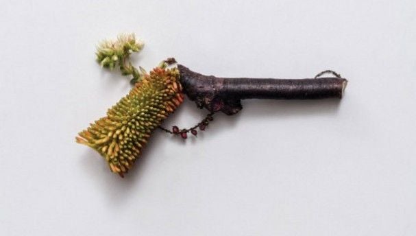 Zij maakte de prachtige serie van kunstwerken compleet gemaakt van gedroogde planten. Hiermee wil ze haar afkeer voor wapens laten zien.
